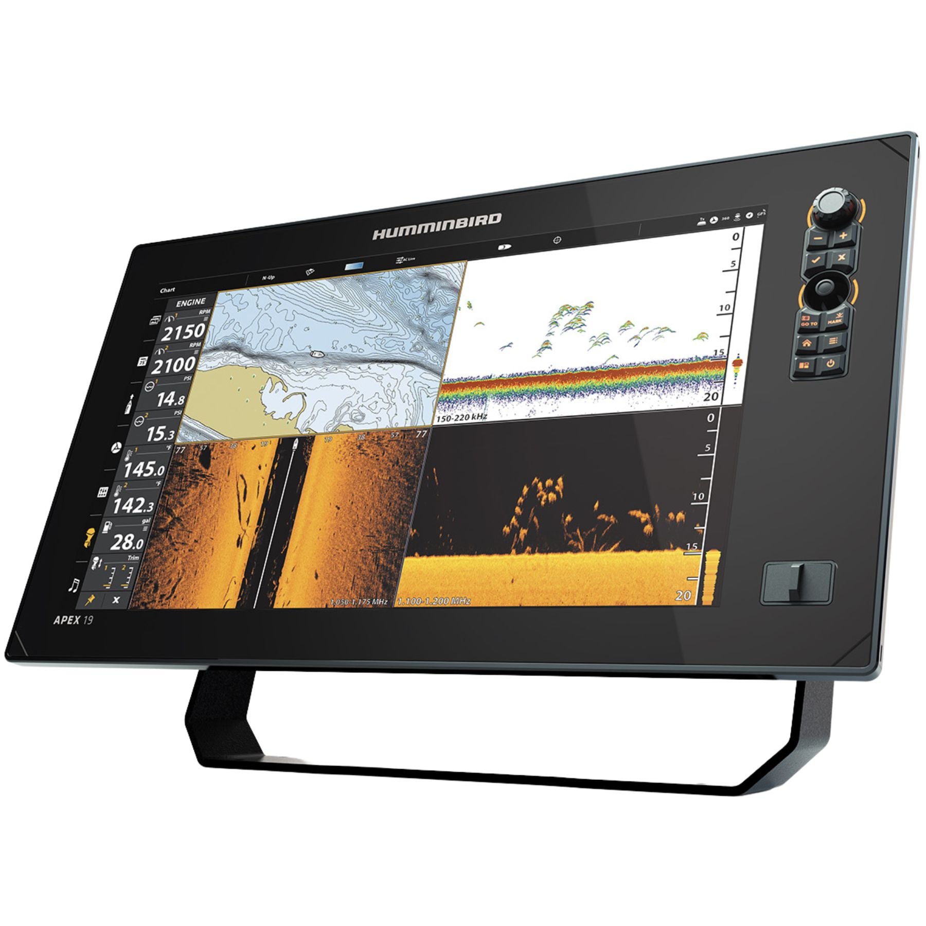Apex 19 tarjoaa 19 tuuman Full HD -kosketusnäytön, jonka kirkkaus (1500 nit) takaa erinomaisen näkyvyyden myös suorassa auringonvalossa. Näytön korkea resoluutio tuo vedenalaisen maailman esiin uskomattomalla tarkkuudella, jolloin rakenteiden, kalaparvien ja kasvillisuuden tunnistaminen on vaivatonta. Käyttö on sulavaa nopean prosessorin ansiosta, ja kosketusnäytön lisäksi laitteessa on fyysiset painikkeet varman hallinnan takaamiseksi kaikissa olosuhteissa.