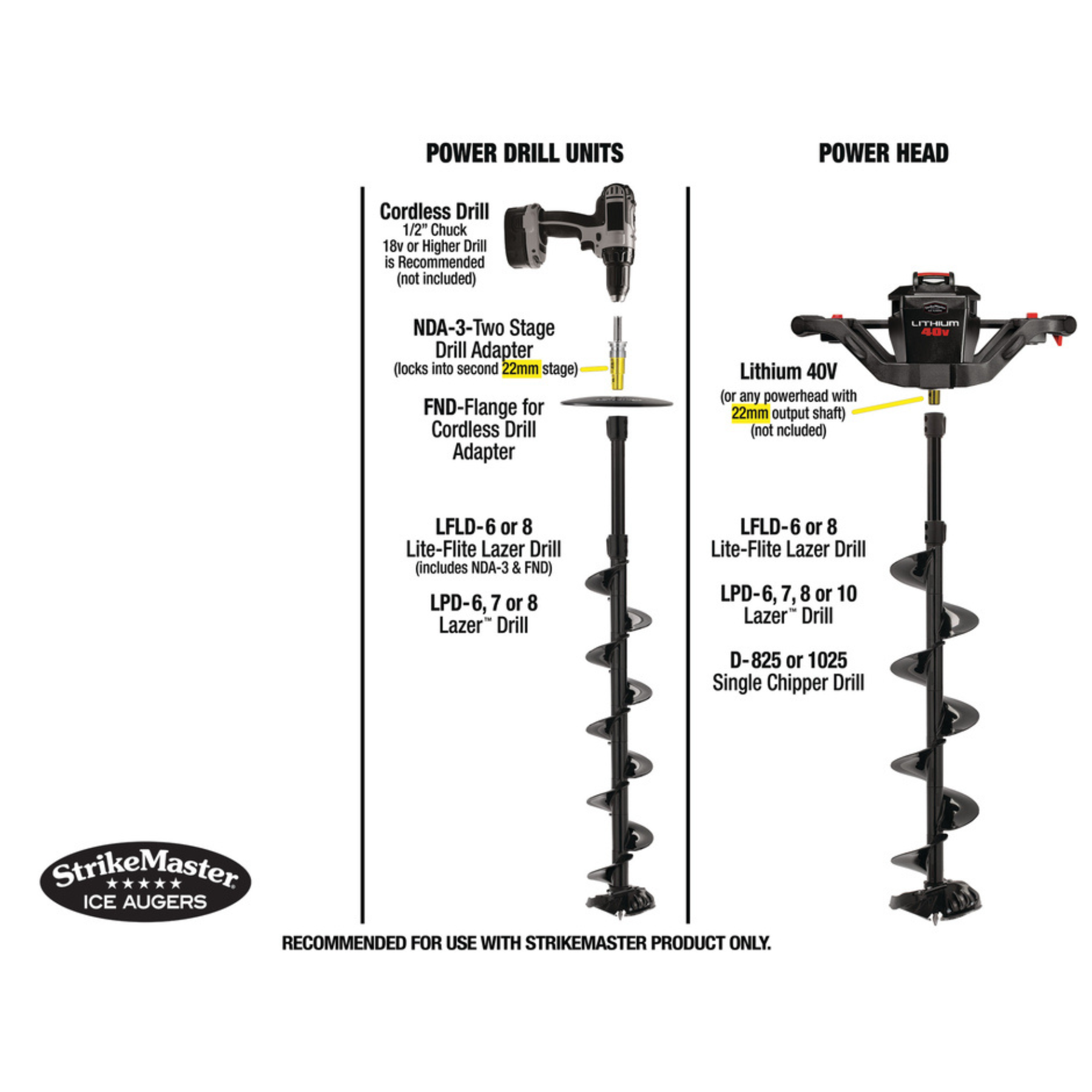 Lite-Flite Lazer sisältää Universal-akkuporakonesovittimen, jossa on vapaasti pyörivä laippa ja integroitu avantoon putoamissuoja. Tämä tuo mielenrauhaa ja suojaa sekä käyttäjää että varusteita. Sovitin mahdollistaa kairan kiinnittämisen suoraan akkuporakoneisiin, sähkövääntimiin tai polttomoottorivääntimiin, kuten StrikeMaster Lithium 24V:hen tai Honda-vääntimeen.