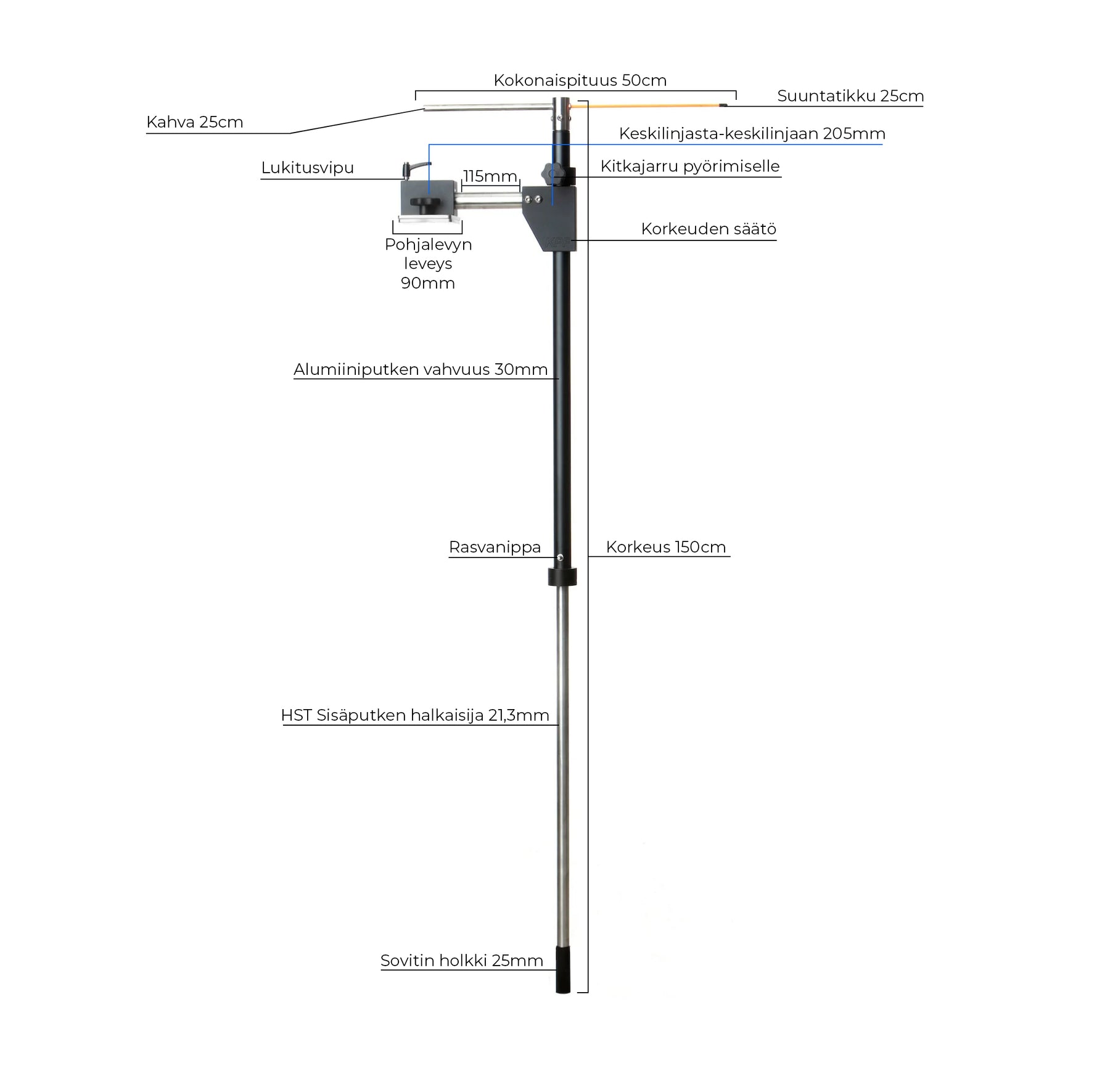 - Kestävä rakenne ja materiaalit: Runko koostuu 150 cm pitkästä A4 ruostumattomasta teräsputkesta, mikä takaa erinomaisen kestävyyden ja pitkäikäisyyden. Eloksoidut alumiiniosat lisäävät korroosionkestävyyttä ja parantavat visuaalista ulkonäköä.