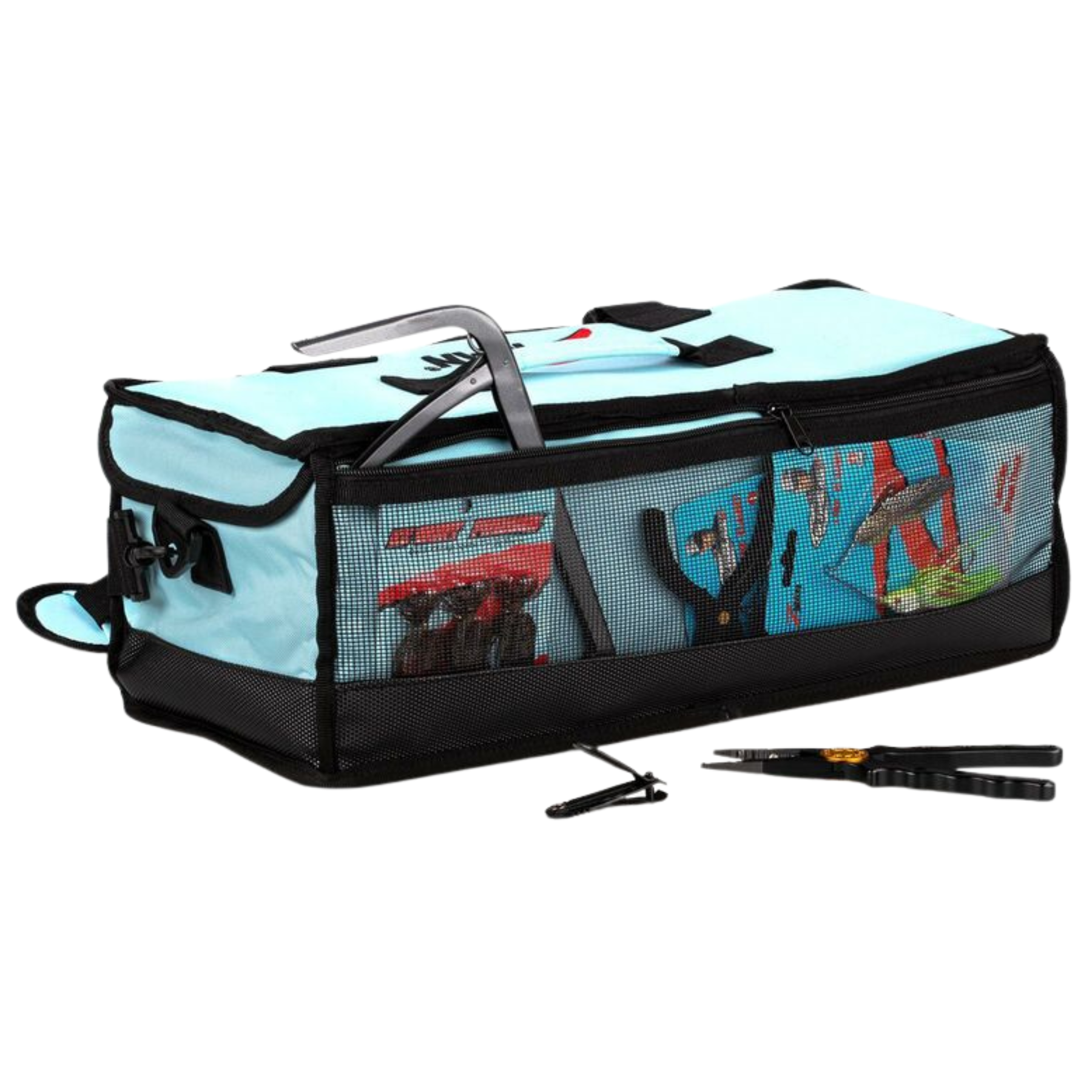 Laukun sisältä löytyy läpinäkyvät tarrakiinnitteiset taskut pienille tarvikkeille, kuten jigipäille ja koukuille. Ulkopuolen verkkotasku tarjoaa lisätilaa esimerkiksi työkaluille ja siimarullille. Kantokahva ja olkahihna tekevät laukusta helpon kuljettaa sekä vesillä että maissa, ja sen kompakti mutta tilava muotoilu varmistaa, että kaikki oleellinen kulkee mukana.